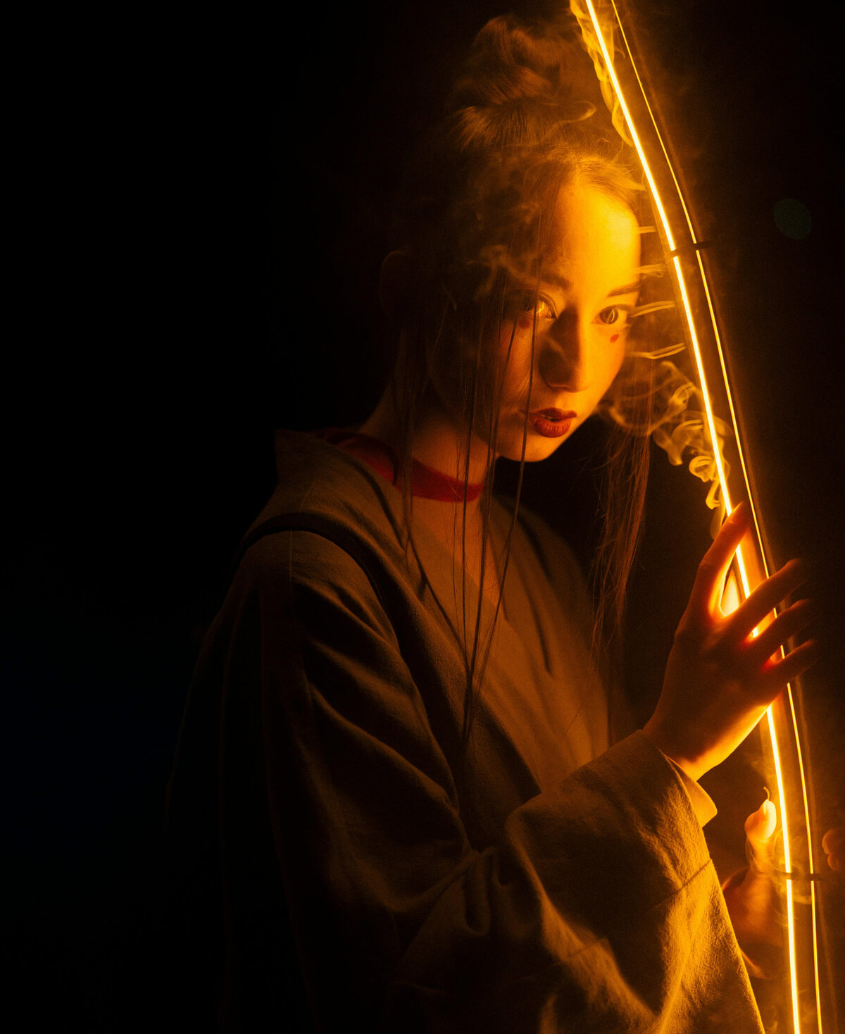 woman posing with yellow beam of lightLink to Larger Item Photo