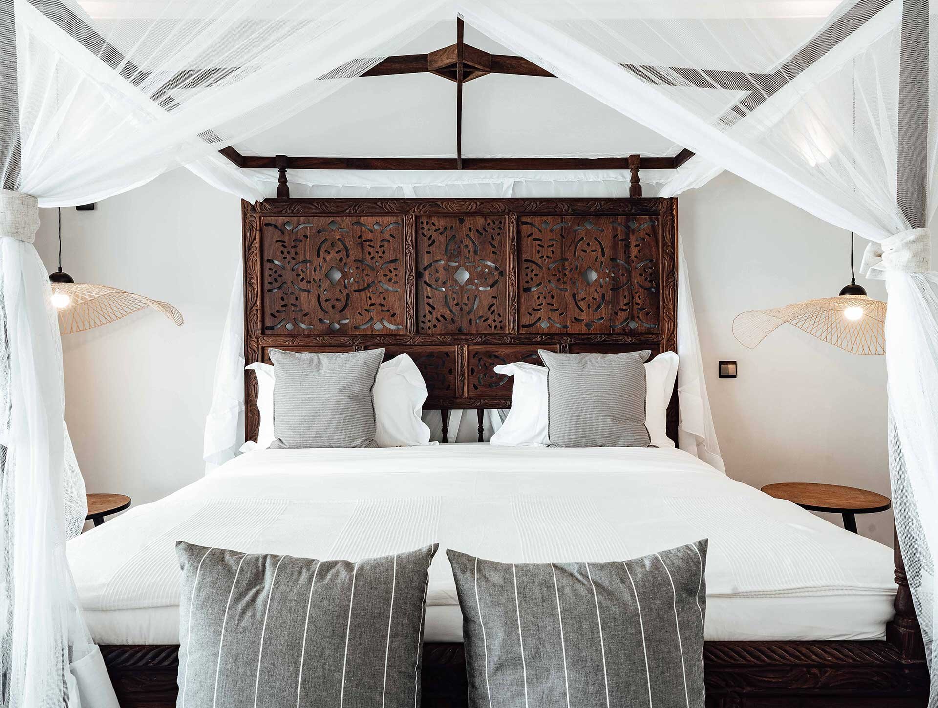 a bed with pillows and a bench in a room Link to Larger Item Photo, ListItemCarouselImage1