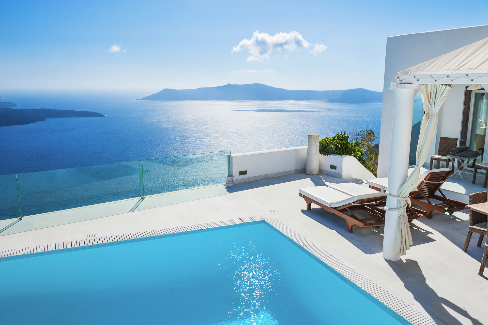 a pool with a view of the ocean with Santorini in the backgroundLink to Larger Item Photo, ListItemCarouselImage1